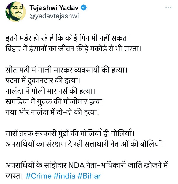 तेजस्वी यादव बिहार की कानून व्यवस्था को लेकर हमलावर