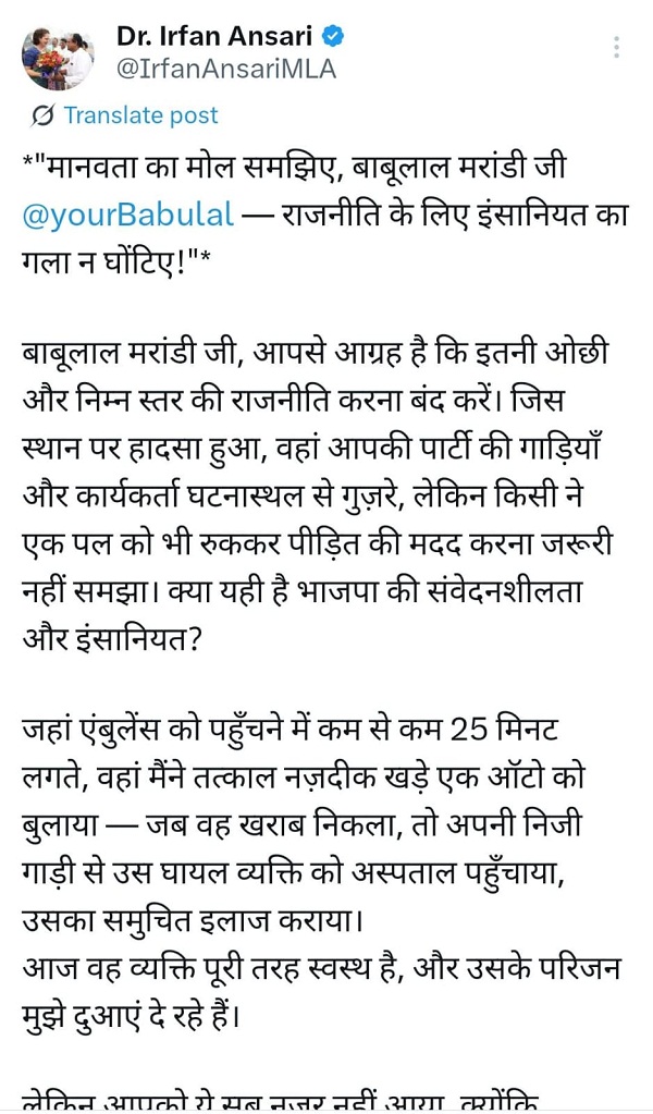 बाबूलाल मरांडी के ट्वीट पर पलटवार हुए सूबे के स्वास्थ्य मंत्री इरफान अंसारी ने बाबूलाल मरांडी पर ओछी राजनीति करने का आरोप लगाया. मंत्री ने कहा कि आपकी पार्टी के कार्यकर्ता घटनास्थल से गुज़रे, लेकिन किसी ने घायल व्यक्ति की मदद नहीं की. टेंपो के खराब होने पर हमने अपनी निजी गाड़ी से घायल व्यक्ति को अस्पताल पहुँचाया और उसका इलाज कराया. अब वह व्यक्ति पूरी तरह से स्वस्थ्य है और उसके परिजन हमें दुआ दे रहे हैं. लेकिन आपको यह सब नहीं दिखता सिर्फ राजनीति करना है. उन्होंने कहा- इंसानियत सबसे बड़ा धर्म है और उस पर राजनीति करना सबसे बड़ा पाप. साथ ही, उन्होंने आग्रह किया कि स्वास्थ्य सेवाओं में हो रहे सुधार की सराहना होनी चाहिए न कि मानवीय प्रयासों का राजनीतिक लाभ के लिए उपहास. मंत्री ने कहा कि जिसकी ज़मीर और मानवता बिक जाए, वो इंसान नहीं बिका हुआ सामान कहलाता है.
