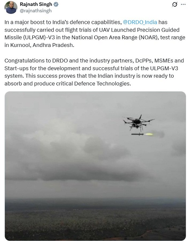 Successful test: भारत ने यूएवी लॉन्च्ड प्रिसिजन गाइडेड मिसाइल-वी3 का सफल परीक्षण किया है. यह परीक्षण आंध्र प्रदेश के कुरनूल जिले में स्थित नेशनल ओपन एरिया रेंज परीक्षण स्थल पर किया गया. इस शानदार उपलब्धि की जानकारी रक्षा मंत्री राजनाथ सिंह ने शुक्रवार एक्स के जरिए साझा की. सफल परीक्षण को लेकर रक्षा मंत्री ने लिखा- “भारत की रक्षा क्षमताओं को बढ़ावा देते हुए डीआरडीओ इंडिया ने आंध्र प्रदेश के कुरनूल में स्थित परीक्षण रेंज, नेशनल ओपन एरिया रेंज में यूएवी लॉन्च्ड प्रिसिजन गाइडेड मिसाइल वी3 का सफलतापूर्वक उड़ान परीक्षण किया है. यूएलपीजीएम-वी3 प्रणाली के विकास और सफल परीक्षणों के लिए डीआरडीओ और इंडस्ट्री पार्टनर्स, एमएसएमई और स्टार्ट-अप को बधाई. यह सफलता साबित करती है कि भारतीय उद्योग अब महत्वपूर्ण रक्षा प्रौद्योगिकियों को आत्मसात करने और उत्पादन करने के लिए तैयार है.” बता दें कि यह डीआरडीओ द्वारा विकसित एक उन्नत हथियार प्रणाली है. यह ड्रोन से लॉन्च की जाती है. यह हथियार प्रणाली आधुनिक युद्ध की जरूरतों को पूरा करने के लिए डिजाइन की गई है.