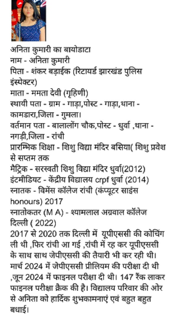 Kamdara, Gumla : पहले प्रयास में ही गुमला की रहनेवाली अनिता कुमारी ने जेपीएससी में सफलता पाई है. अनिता कुमारी को एसटी कैटेगरी में 10वां जबकि ओवरऑल रैंक 147वां मिला है. उन्हें झारखंड प्रशासनिक सेवा मिला है. उनकी सफलता से कामडारा प्रखंड के गाड़ा गांव के लोग काफी खुश हैं, क्योंकि अनिता कुमारी यहीं की रहने वाली है. माता-पिता भी बेटी की सफलता से गदगद हैं. अनिता के पिता शंकर बड़ाईक, झारखंड पुलिस इंस्पेक्टर के पद से सेवानिवृत्त हैं और मां ममता देवी गृहिणी हैं. वर्तमान में अनिता का परिवार बालालोंग, धुर्वा, रांची में निवास करता है. अनिता की दसवीं की पढ़ाई सरस्वती शिशु विद्या मंदिर, धुर्वा वहीं 12वीं की पढ़ाई केंद्रीय विद्यालय सीआरपीएफ, धुर्वा, रांची से पूरी की है. इसके बाद अनिता ने रांची महिला कॉलेज, रांची से स्नातक (बीसीए) और श्यामलाल अग्रवाल कॉलेज, दिल्ली से सोशियोलॉजी में मास्टर डिग्री हासिल की.
