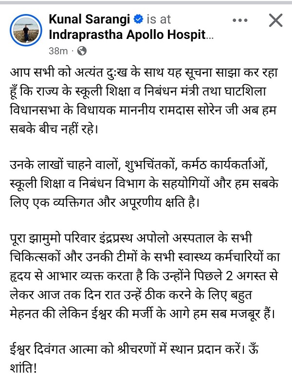 गौरतलब है कि दो अगस्त को जमशेदपुर स्थित आवास में बाथरूम में गिरने से रामदास सोरेन को गंभीर चोट लगी थी. ब्रेन हेमरेज के बाद उन्हें एयरलिफ्ट कर दिल्ली के अपोलो अस्पताल में भर्ती कराया गया. वहां डॉक्टरों की देखरेख में उनका इलाज जारी था, लेकिन शुक्रवार रात उन्होंने अंतिम सांस ली.