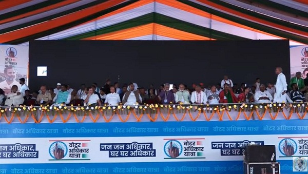 मंच पर राहुल गांधी के साथ राजद अध्यक्ष लालू प्रसाद यादव, नेता प्रतिपक्ष तेजस्वी यादव, कांग्रेस अध्यक्ष मल्लिकार्जुन खरगे और विकासशील इंसान पार्टी (वीआईपी) के प्रमुख मुकेश साहनी सहित कई बड़े नेता मौजूद रहे. एक ही मंच पर इतनी बड़ी संख्या में विपक्षी दलों के दिग्गज नेताओं का आना इस बात का संकेत माना जा रहा है कि बिहार विधानसभा चुनाव से पहले महागठबंधन मतदाताओं को एकजुट करने और चुनावी मैदान में पूरी मजबूती से उतरने की तैयारी में है.